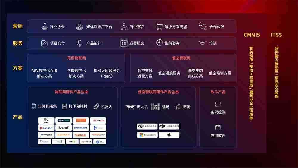 聚合国内外先进的物联网硬件产品品牌,,,聚焦数字化仓储、、、、机器人运营、、、低空智联网等领域,,,,共同打造适合客户业务场景的解决方案并提供交付服务